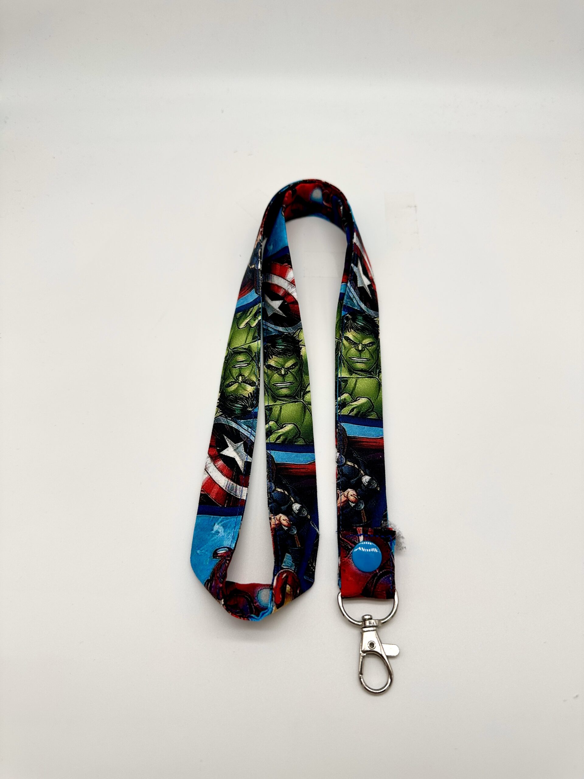 Porta badge in cotone, con bottoncino che permette di rimuover il moschettone. Lo trovi in vari colori e fantasie.